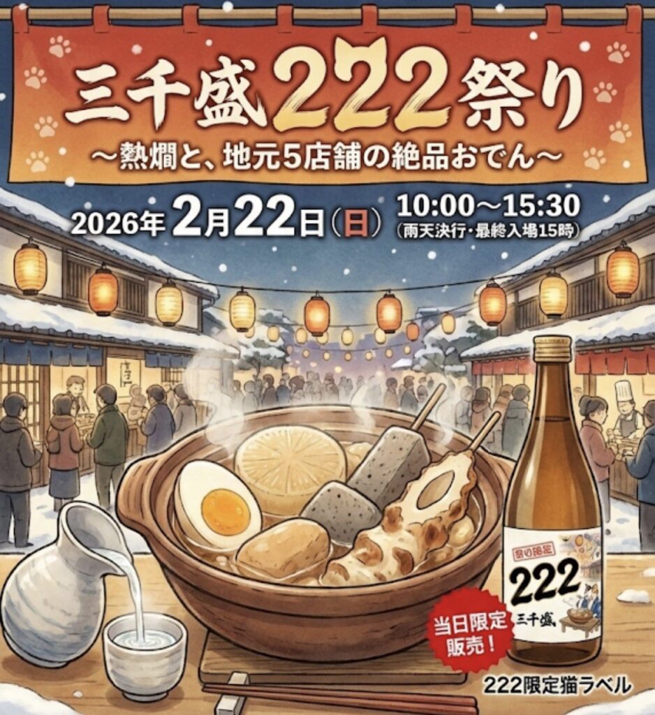 イベントでは、三千盛のお酒に加え、地元5店舗の絶品おでんも一緒に味わえます。お店によって異なるこだわりと味わいを食べ比べたり、出汁割りをしたり、「日本酒×おでん」を満喫してみてはいかがでしょうか。また、2月22日、「にゃんにゃんにゃんの日」にちなみ、222限定猫ラベルのお酒やオリジナルグラスも販売します。