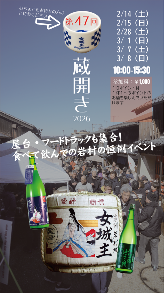岩村醸造の蔵開きは、2月〜3月にかけて週末に開催されます。2026年は2月14日(土)、15日(日)、28(土)、3月1日(日)、7日(土)8日(日)の計6日間。屋台やフードトラックも集合するため、町並み全体が活気に溢れます。